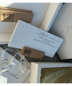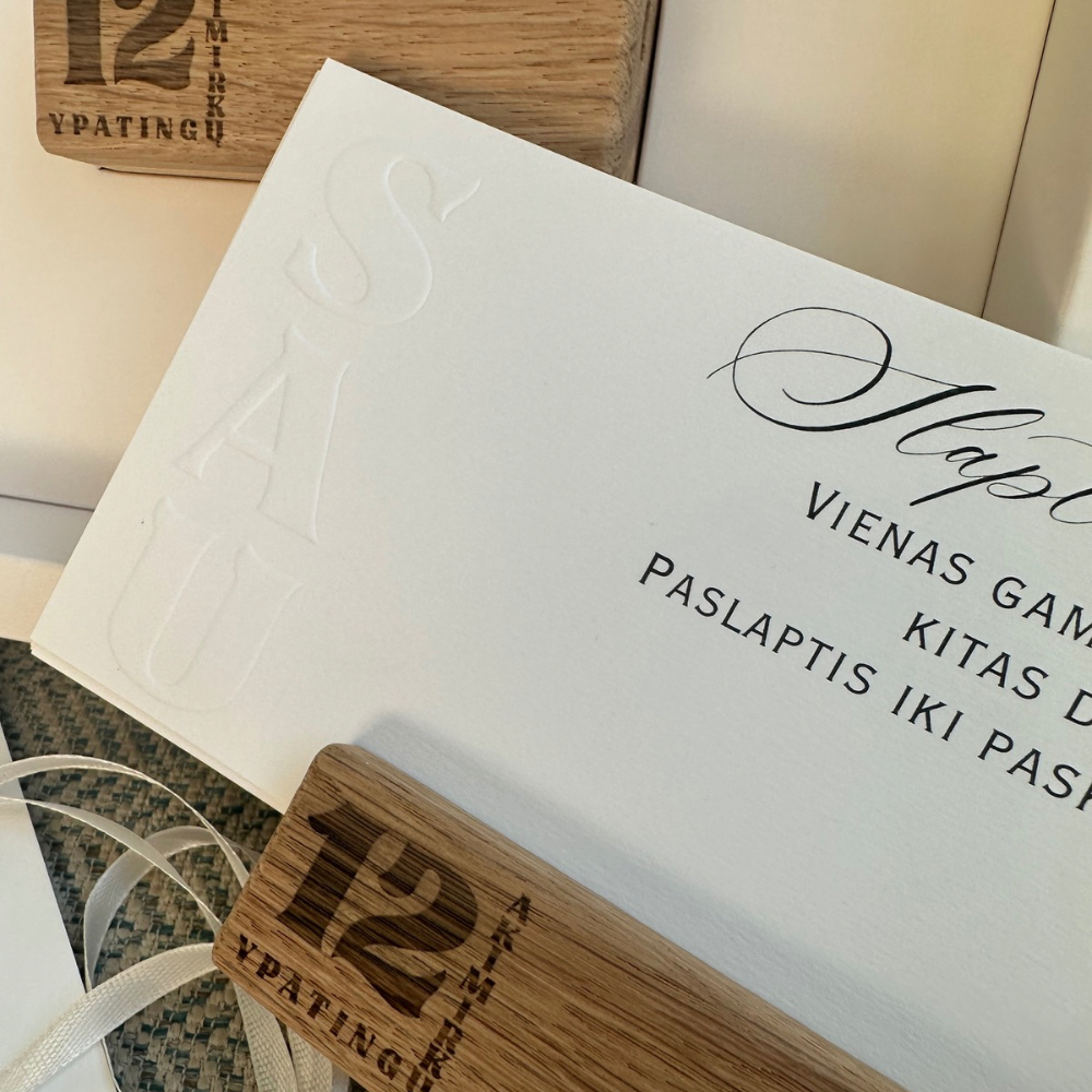 • Stilinga, kokybiška ir dovanai paruošta dėžutė. (Dėžutės viduje pritaikytas insertas mediniui stoveliui, kad jis tvirtai būtų įstatytas, o kortelės supakuotos į auksi spalvos šilko popierių)