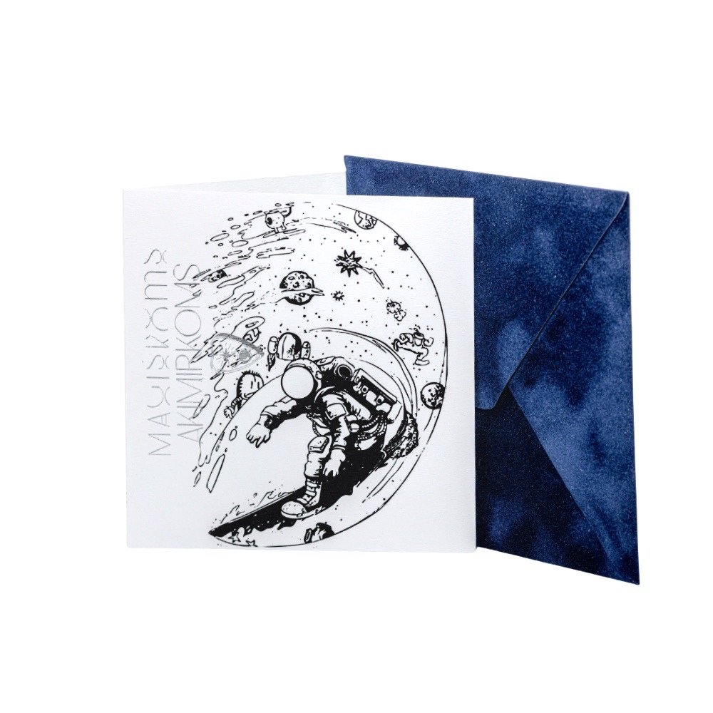 Taip pat galima rinktis su sveikinimo tekstu viduje supakuotus prabangiai veliūriniame voke su vaško spaudu.