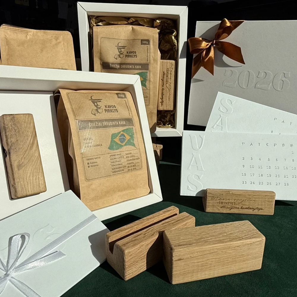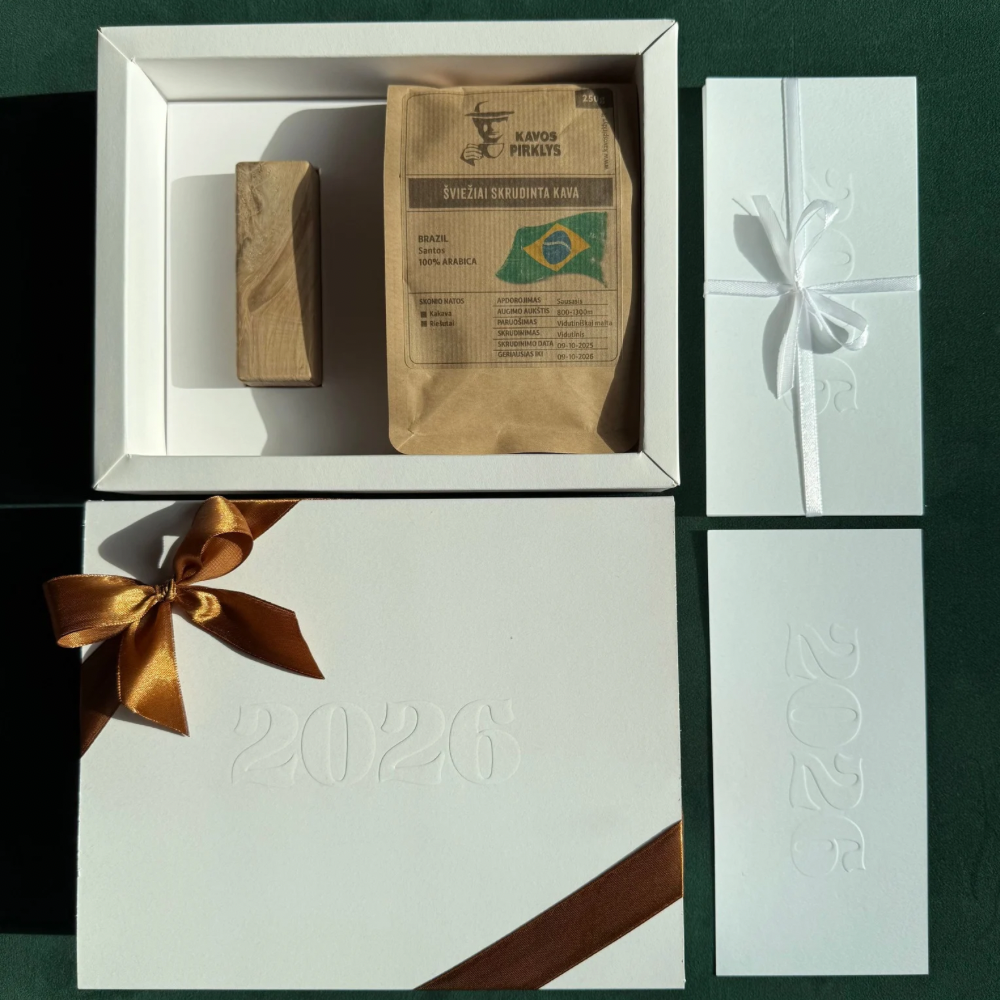 • Dovanos pakuotė standartiškai dekoruota subtiliu reljefiniu įspaudu 2026, taip pat yra galimybė personalizuoti pagal įmonės poreikius, su logotipu ar palinkėjimu (teirautis individualiai)