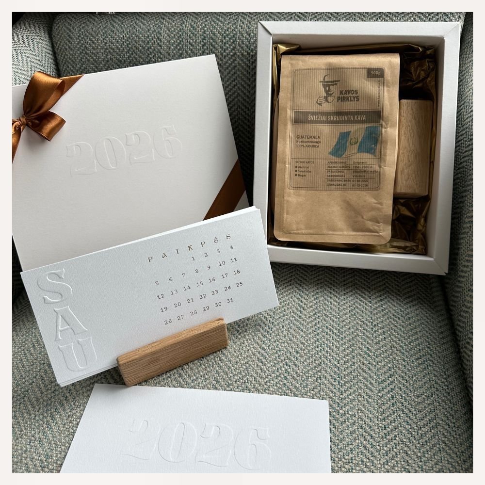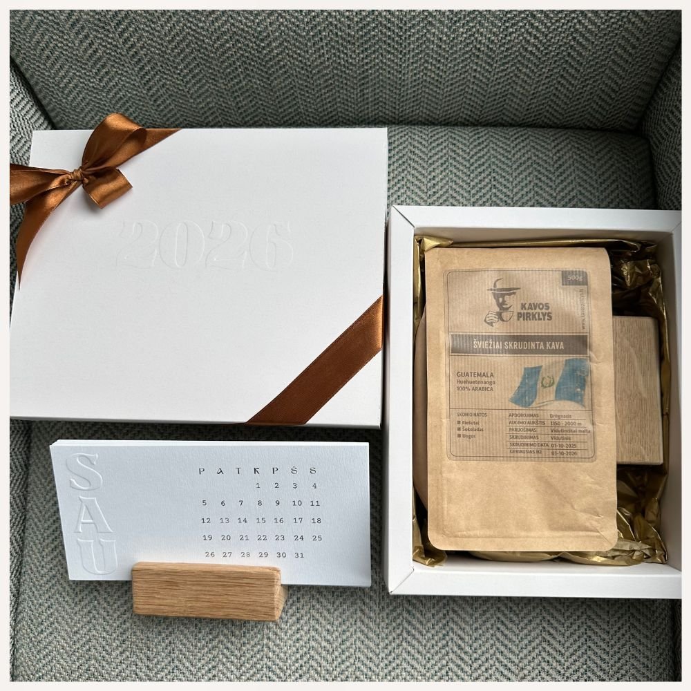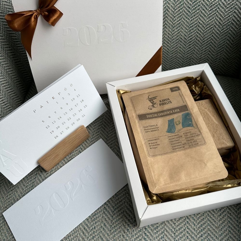 Atraskite išskirtinį stalo kalendorių su kava, kuris taps ne tik praktišku metų palydovu, bet ir rafinuotu dovanos sprendimu jūsų partneriams, klientams ar artimiesiems.